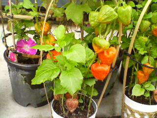 よく手入れされた朝顔とほおずき。